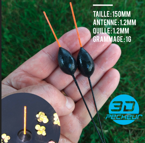 Flotteur 1G destiné à la pêche au coup en rivière. Pour réussir à obtenir un modèle sensible, robuste et équilibré avec une quille et une antenne fine, la forme et plus particulièrement les jonctions entre les différentes parties du flotteur ont été renforcées pour une impression 3D FDM du modèle.