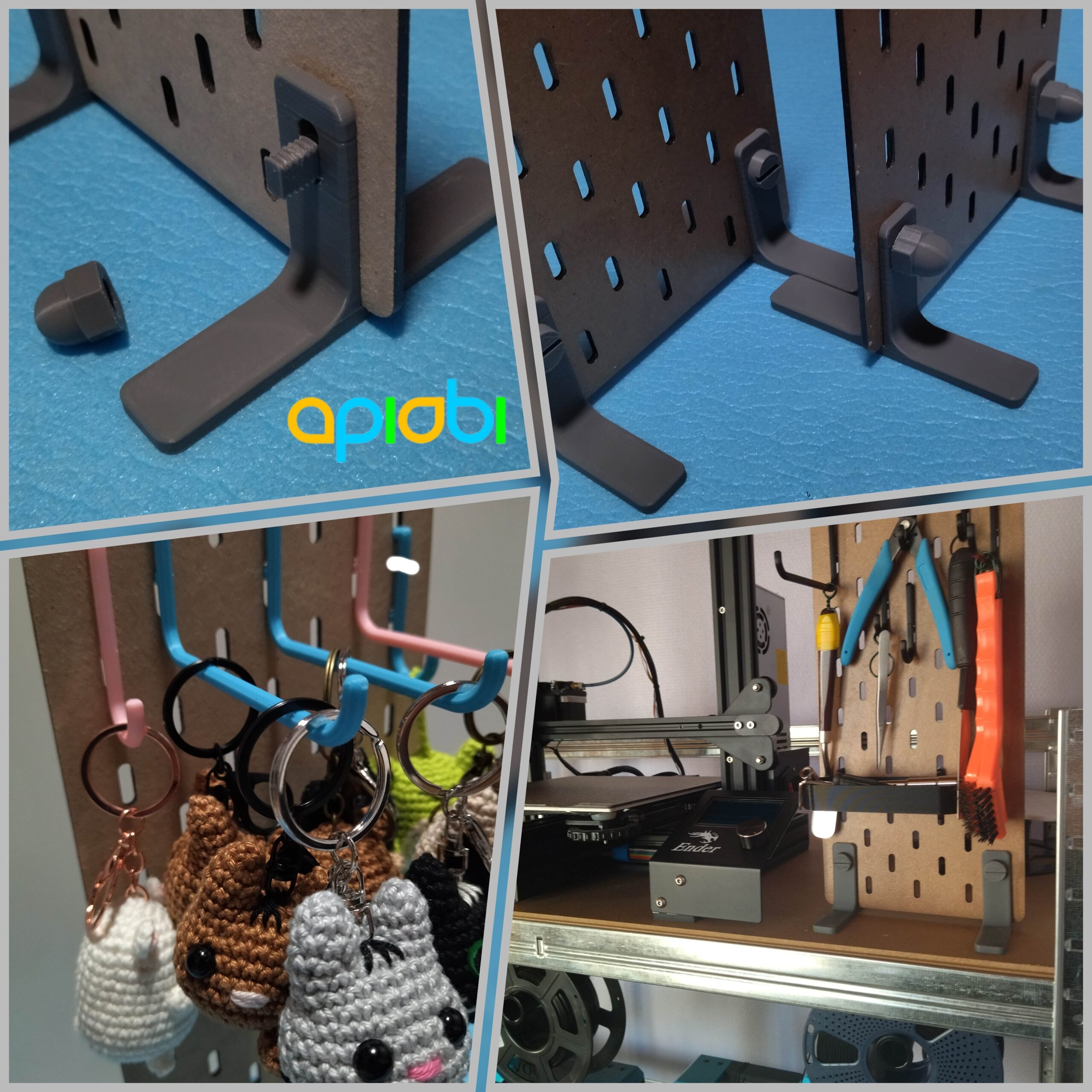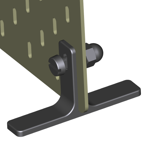 Grâce aux pieds + vis + écrou au look ‘indus’, tous imprimables en 3D et entièrement compatibles avec les panneau perforés de la marque IKEA, ce panneau tient parfaitement debout et devient un support verticale pratique, portable et terriblement polyvalent.